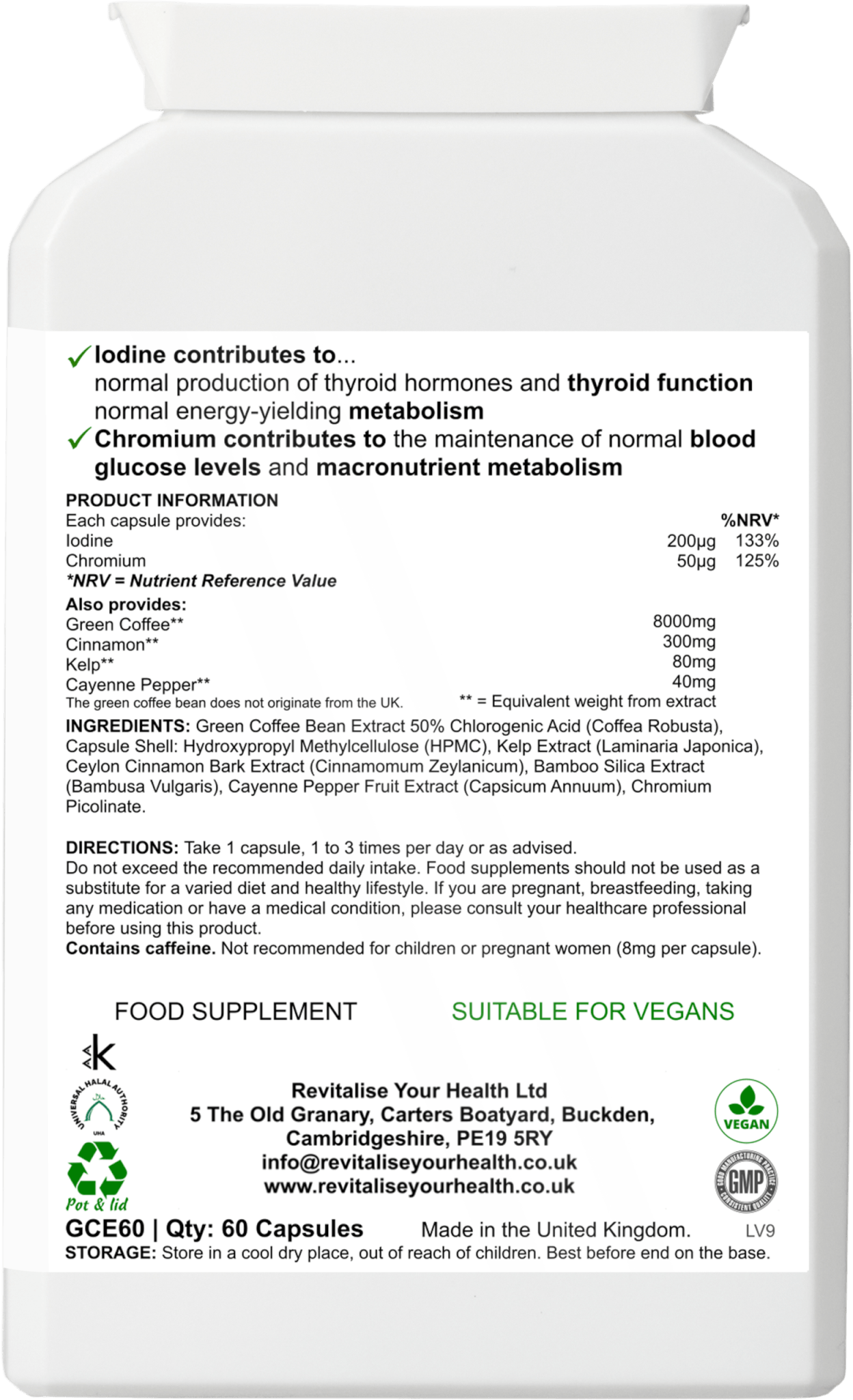 This green coffee bean supplement is unique, in that it also contains kelp (bladderwrack), cinnamon and cayenne (420mg) for that extra kick, plus iodine and chromium picolinate.