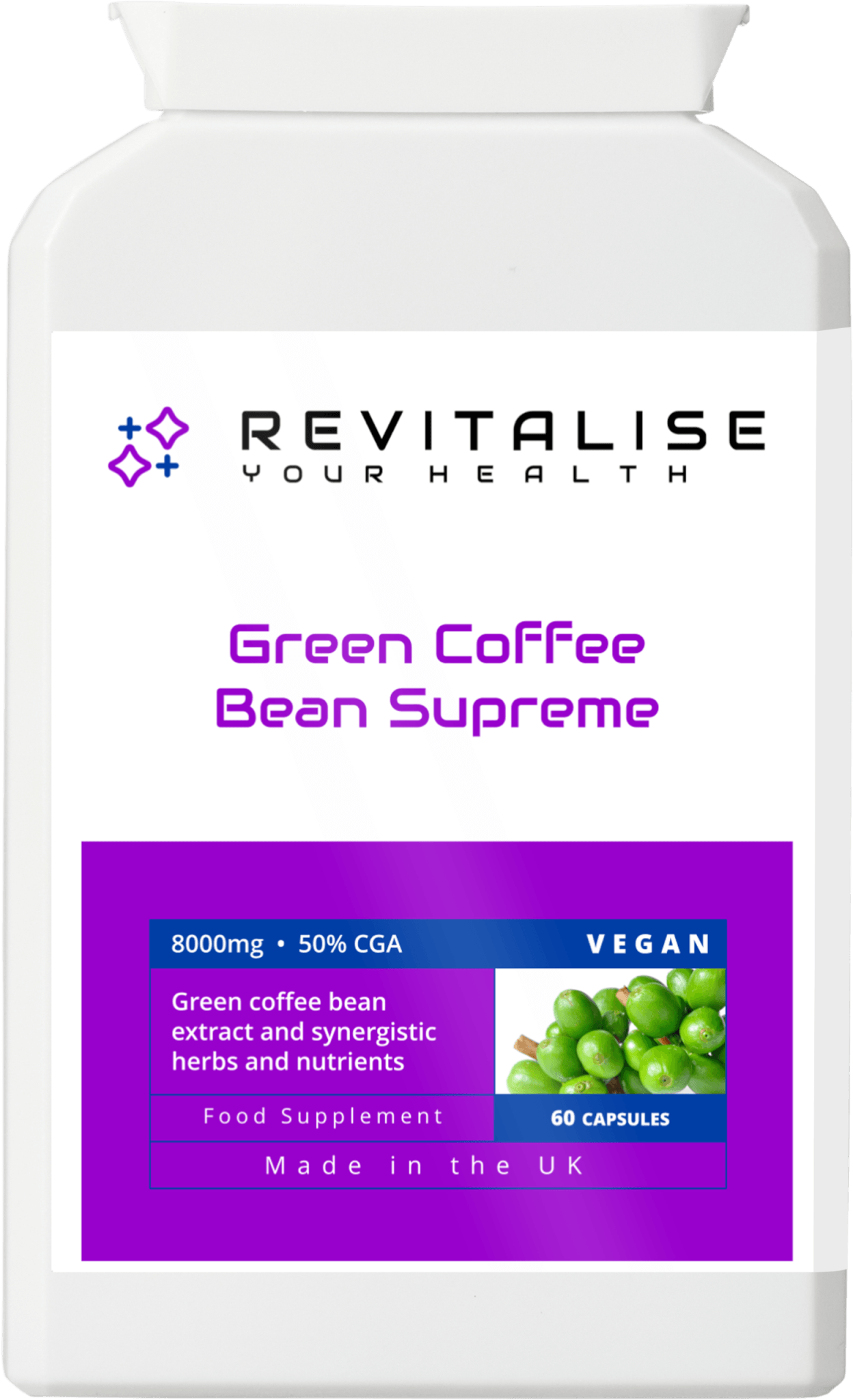 Green Coffee Bean Supreme is a high-strength, natural slimming formula. It contains green coffee bean (8000mg) derived from “raw” unroasted coffee beans and provides 50% chlorogenic acid (CGA).