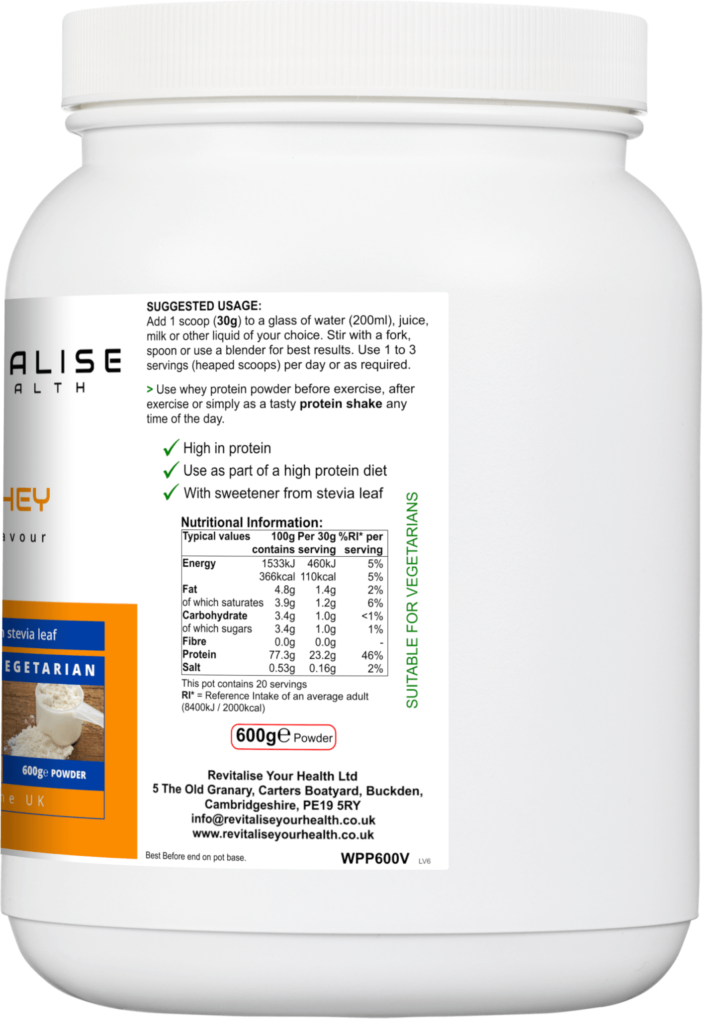 A premium quality vanilla flavoured whey protein powder, derived from a blend of concentrate and isolate – NO artificial colours or sweeteners.