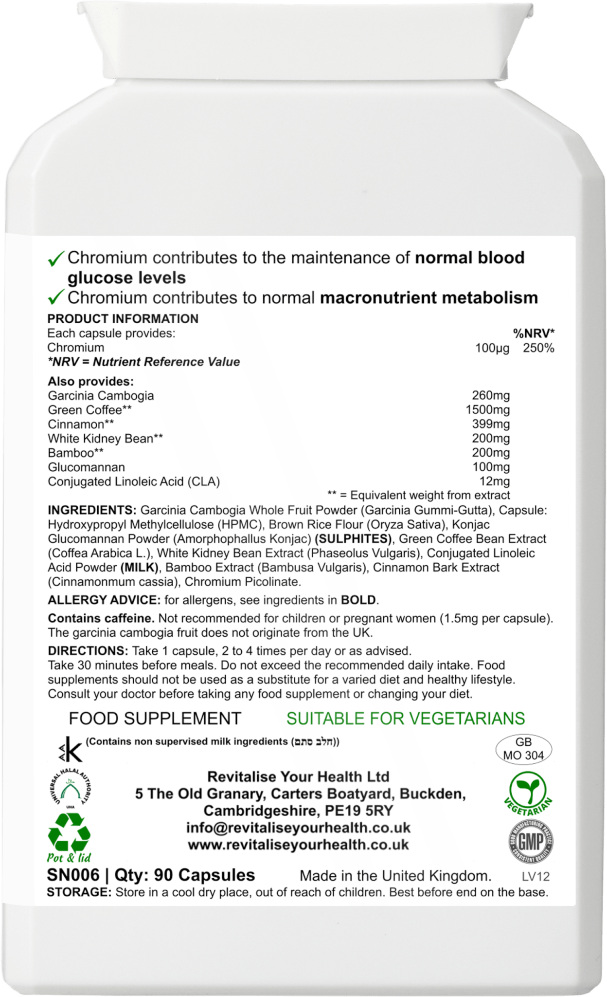 90 capsules per potEach capsule provides: %NRV* Chromium - 100μg 250%*NRV = Nutrient Reference ValueAlso provides: Garcinia Cambogia - 260mg Green Coffee** - 1500mg Cinnamon** - 399mg White Kidney Bean** - 200mg Glucomannan - 100mg Conjugated Linoleic Acid (CLA) - 12mg** = Equivalent weight from extractINGREDIENTS: Garcinia Cambogia Powder (Garcinia Gummi-Gutta), Stoneground Brown Rice Flour (Oryza Sativa), Capsule: Hydroxypropyl Methylcellulose (HPMC), Konjac Glucomannan Powder (Amorphophallus Konjac) (SULPHITES), Green Coffee Bean Extract (Coffea Arabica L.), White Kidney Bean Extract (Phaseolus Vulgaris), Conjugated Linoleic Acid Powder (MILK), Cinnamon Bark Extract (Cinnamonmum cassia), Chromium Picolinate Powder.ALLERGY ADVICE: for allergens, see ingredients in BOLD. Contains caffeine. Not recommended for children or pregnant women (1.5mg per capsule).Suitable for vegetarians Kosher approved